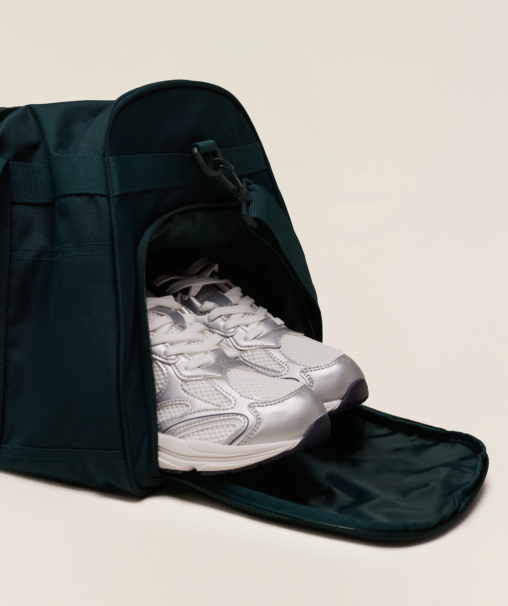 - External shoe pocket / wet pocket with breathable eyelets to keep things fresh
