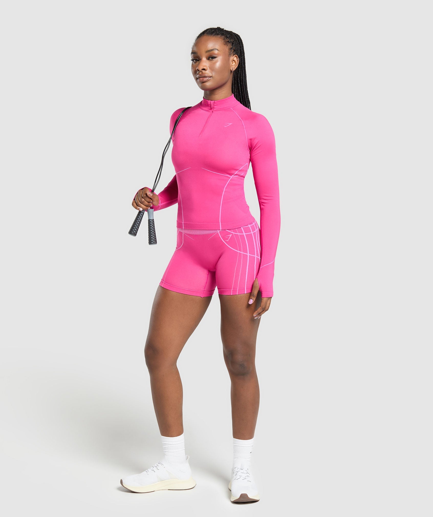 • Breathable knit structures keep you cool• Seamless design for max comfort & zero distractions• Thumbholes to sleeves so they stay put (plus we all love ‘em)• Contoured mesh detailing to enhance your physique• Quarter zip• High neck for extra coverage• Knitted in logo